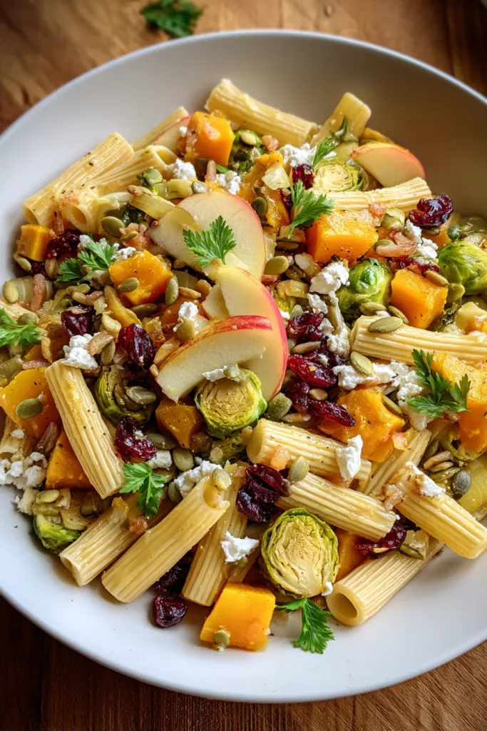 This Autumn Harvest Pasta Salad is a colorful medley of roasted butternut squash and Brussels sprouts, fresh apple, and chewy cranberries, all tossed in a tangy dressing. Perfect for gatherings or cozy dinners.