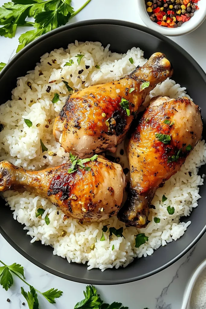 Succulent chicken legs bake atop fragrant, spice-kissed rice that absorbs all the savory juices for a comforting, hassle-free meal the whole family will love.