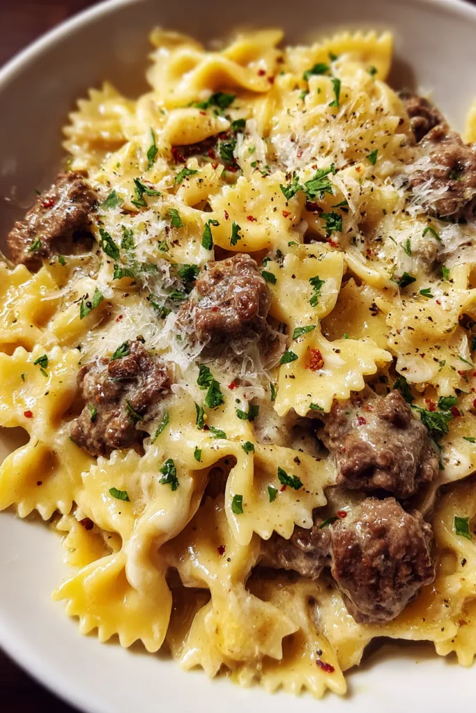 Savor tender beef combined with bowtie pasta, all enveloped in a rich garlic butter sauce. This dish is cheesy, comforting, and perfect for any dinner table!