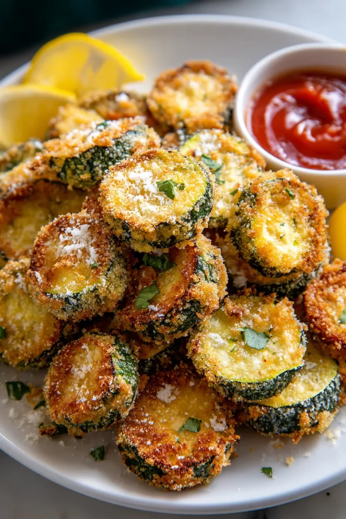 Serve the crispy buttery fried zucchini immediately with lemon wedges and optional dipping sauces like marinara or ranch.