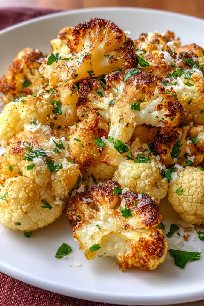 Transfer the crispy roasted cauliflower to a serving platter. Garnish with fresh parsley for a pop of color and freshness.