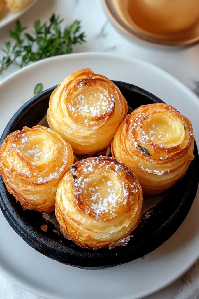 12. Carefully lift the cruffins out, place them on a wire rack, and dust generously with powdered sugar. Serve warm and enjoy the layers of flaky bliss!