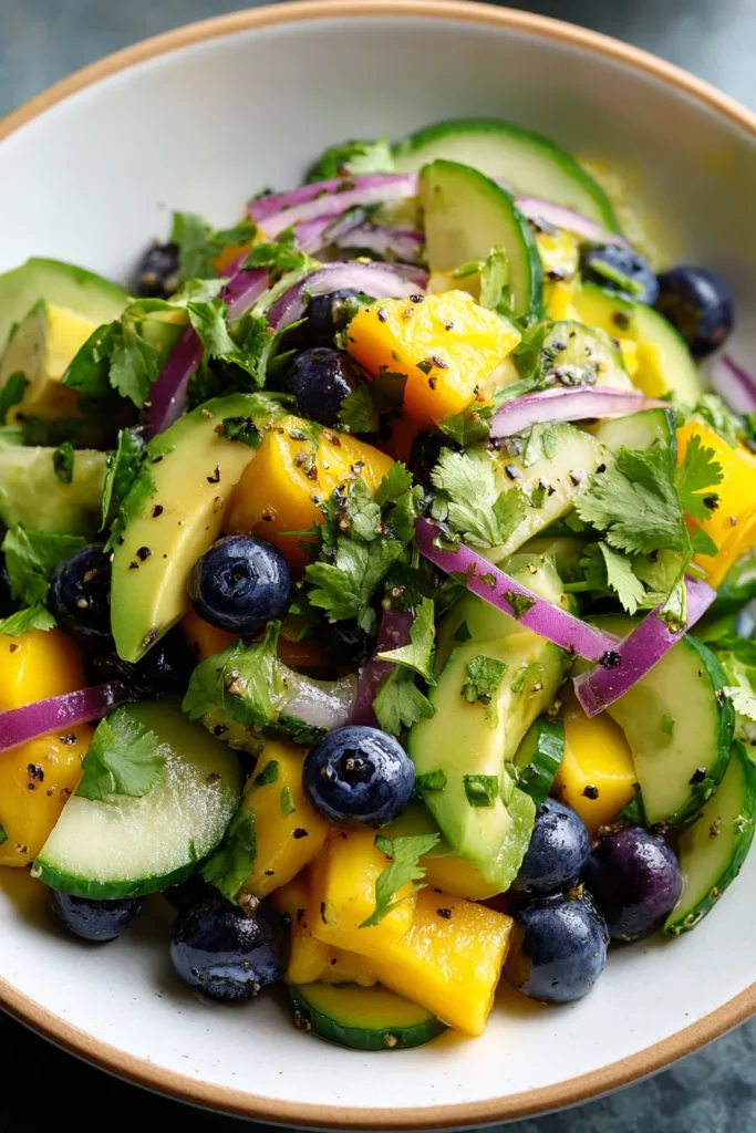 Experience a burst of tropical flavors in this vibrant salad, featuring juicy mangoes, crunchy cucumbers, and sweet blueberries, all combined with creamy avocado for the ultimate refreshment.
