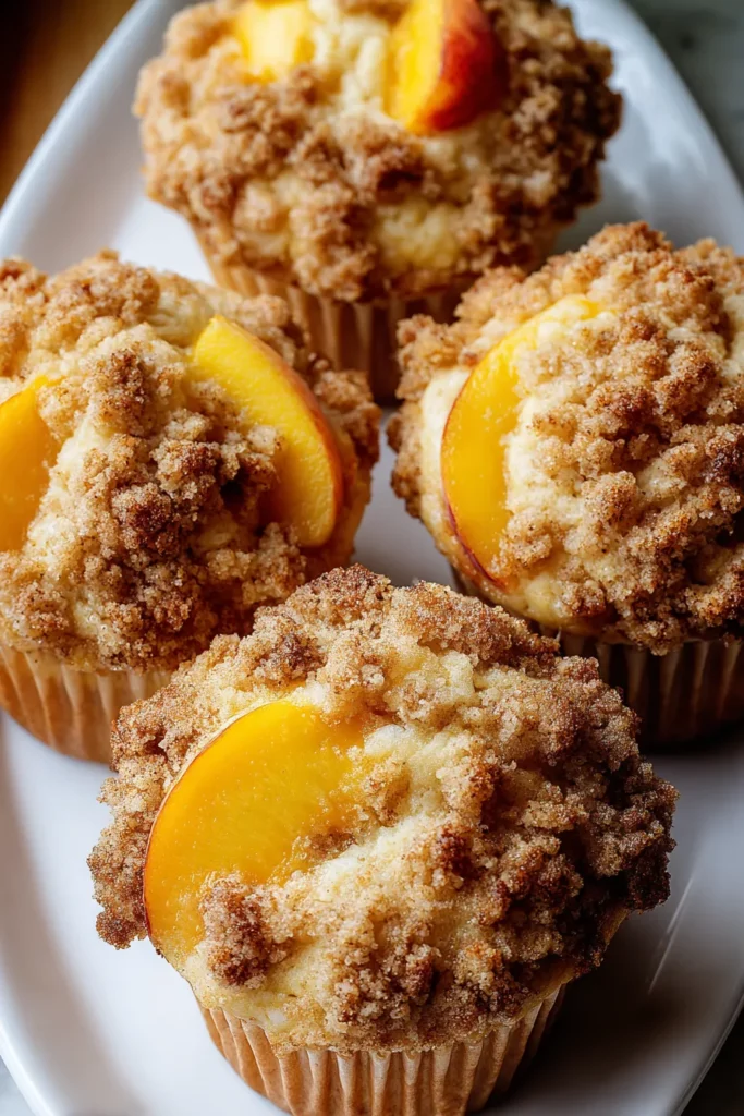 These muffins are perfectly fluffy with chunks of fresh peaches and a crunchy, sweet crumb topping, making them a perfect snack or breakfast treat.