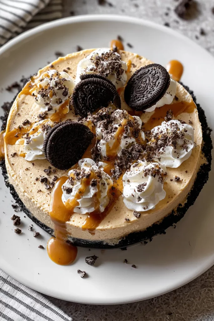 Spoon the filling into the cooled Oreo crust, spreading evenly.