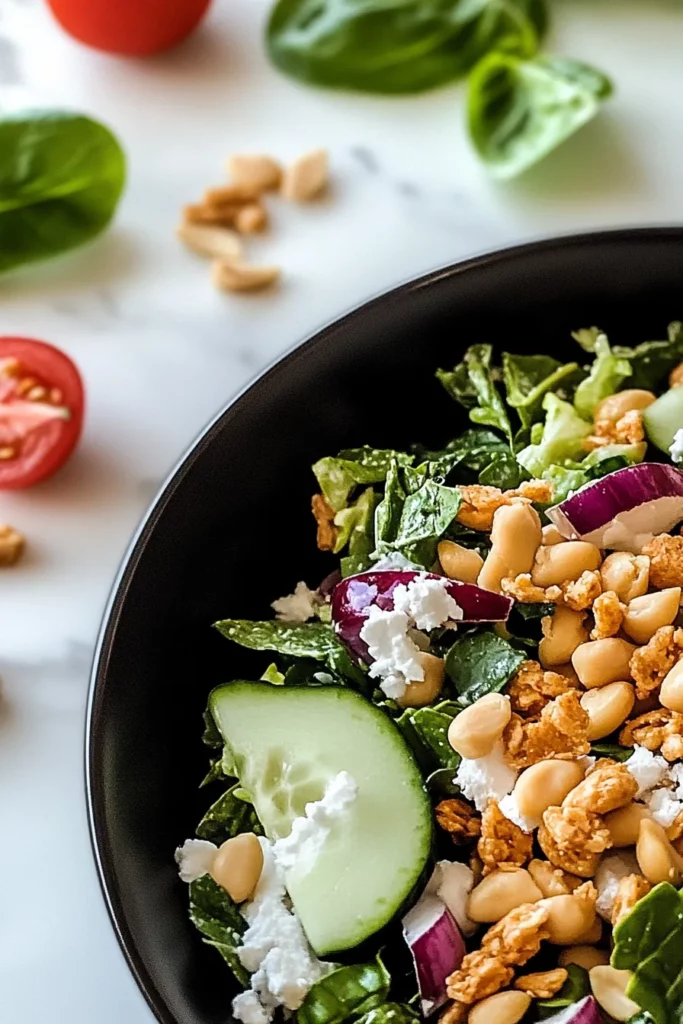 There’s nothing quite like biting into a salad that surprises you with every forkful. The Peanut Crunch Salad does just that, weaving together fresh greens with a symphony of textures—from tender spinach and peppery arugula to the irresistible snap of shredded carrots and the crispness of bell peppers and cucumbers. Each layer feels like a mini celebration: bright red cabbage ribbons add a pop of color, while cilantro lends that fresh, citrusy note that lifts the entire bowl. And let’s not even get started on the roasted peanuts and chow mein noodles—they bring in that addictive crunch that makes you go back for seconds before you even realize it.