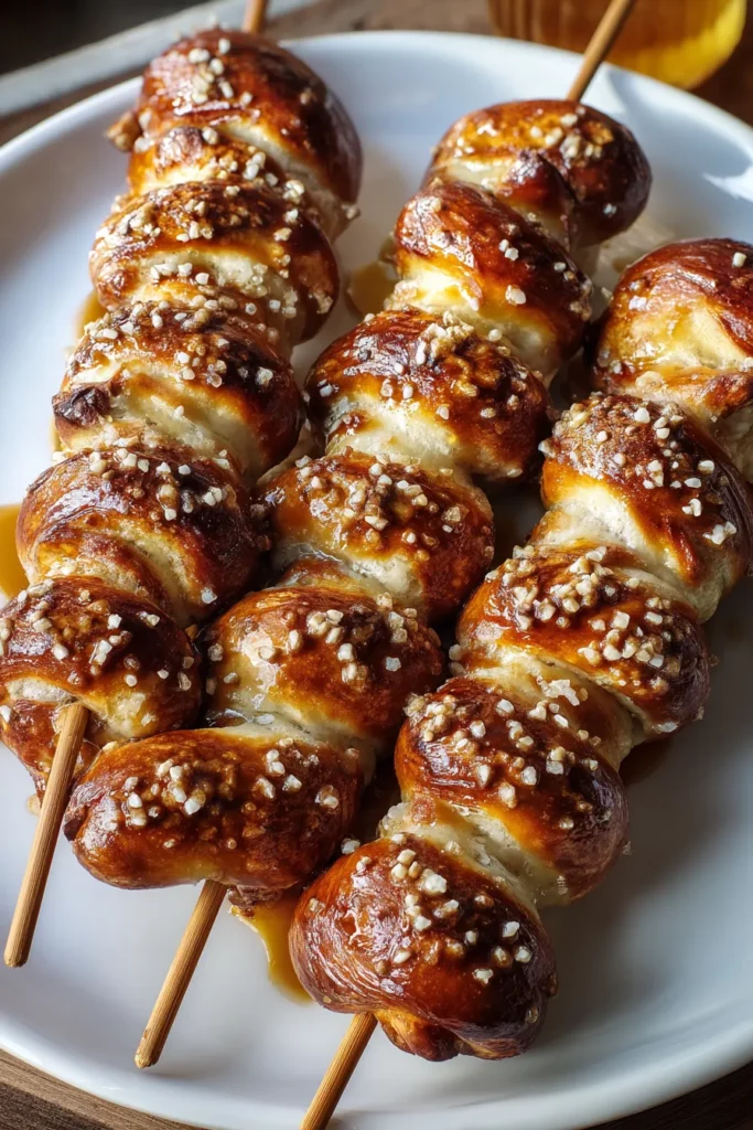 These Bavarian-style pretzel skewers are soft on the inside, with a golden-brown crust and a sprinkle of coarse sea salt, perfect for dipping into your favorite sauces.
